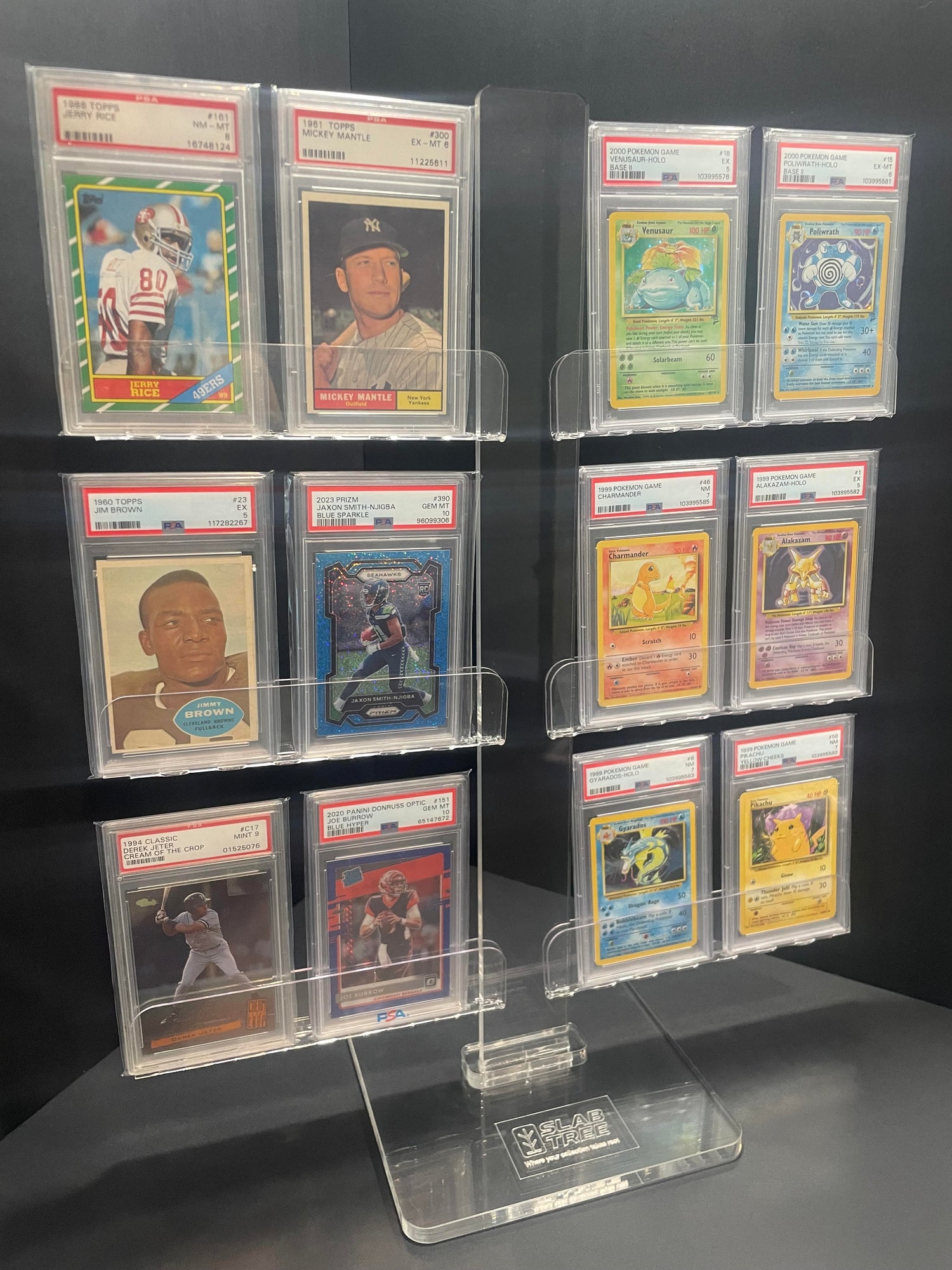 The Slab Tree is a unique modular display stand designed to showcase your graded sports cards and TCG cards, as well as ungraded cards in magnetic style holders. Using innovative technology, each arm features a precision-engineered slot system that securely and universally fits your cards. Whether you collect PSA, SGC, BGS, CGC, or raw cards, the Slab Tree helps you showcase your best cards in style.