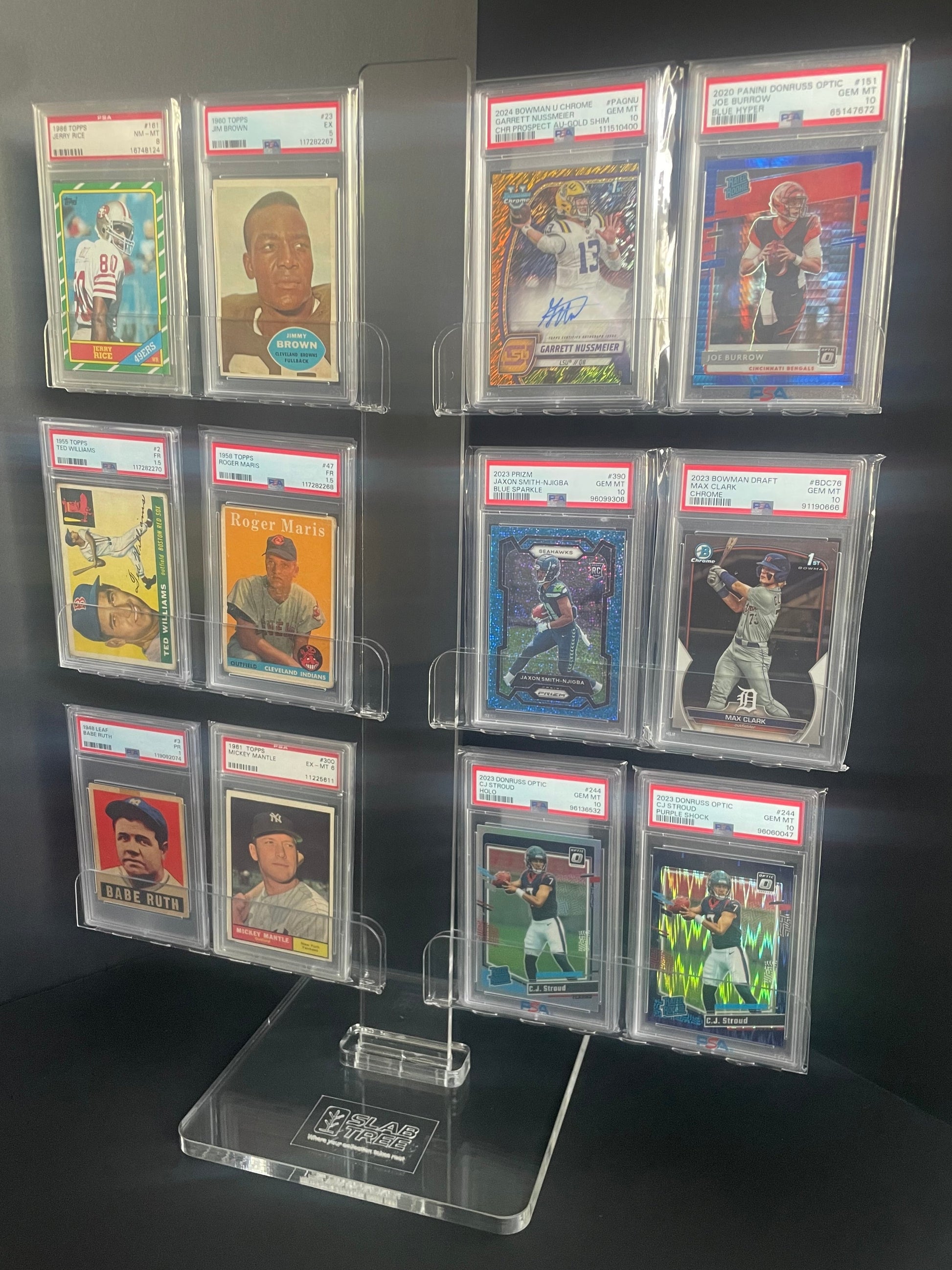Looking for the best way to display your graded sports cards or trading card game (TCG) slabs? The Slab Tree is the ultimate card display stand for serious collectors. Designed to hold up to 12 graded cards or raw cards in a 35pt. magnetic holder securely.